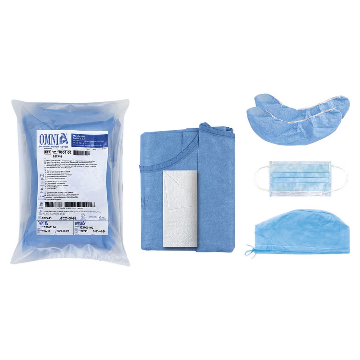 Περιλαμβάνει: 1 Χειρουργικά διπλωμένη ποδιά Special Plus (μέγεθος M) και 2 πετσέτες χεριών τυλιγμένες σε ιατρικό χαρτί, 1 διάτρητο σκούφο για άντρες και γυναίκες, 1 μάσκα Spiritus Plus με λάστιχα στερέωσης στα αυτιά, 2 αντιολισθητικά καλύμματα παπουτσιών.